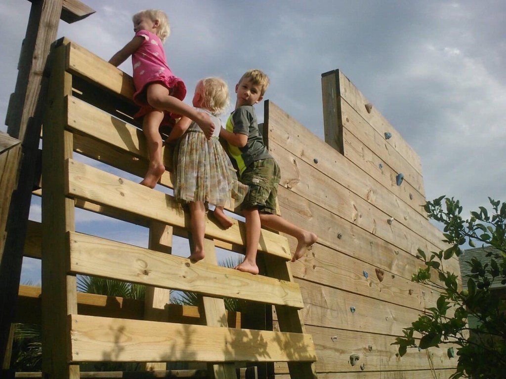 So back to the backyard fence. I’m not exceptionally handy by any means but it was pretty easy for me to build a ladder instead of a fence section. It had a little bit of an angle on one side and straight up and down on the other side. From the outside of my yard, it looked much like a fence but on the inside much more like a ladder. Look at the wall behind it. That is a 15-foot climbing wall with hand holes and plastic foot holds. My kids climbed. All the time. It wasn’t pushed on them it was just there for play. It was a part of their norm.